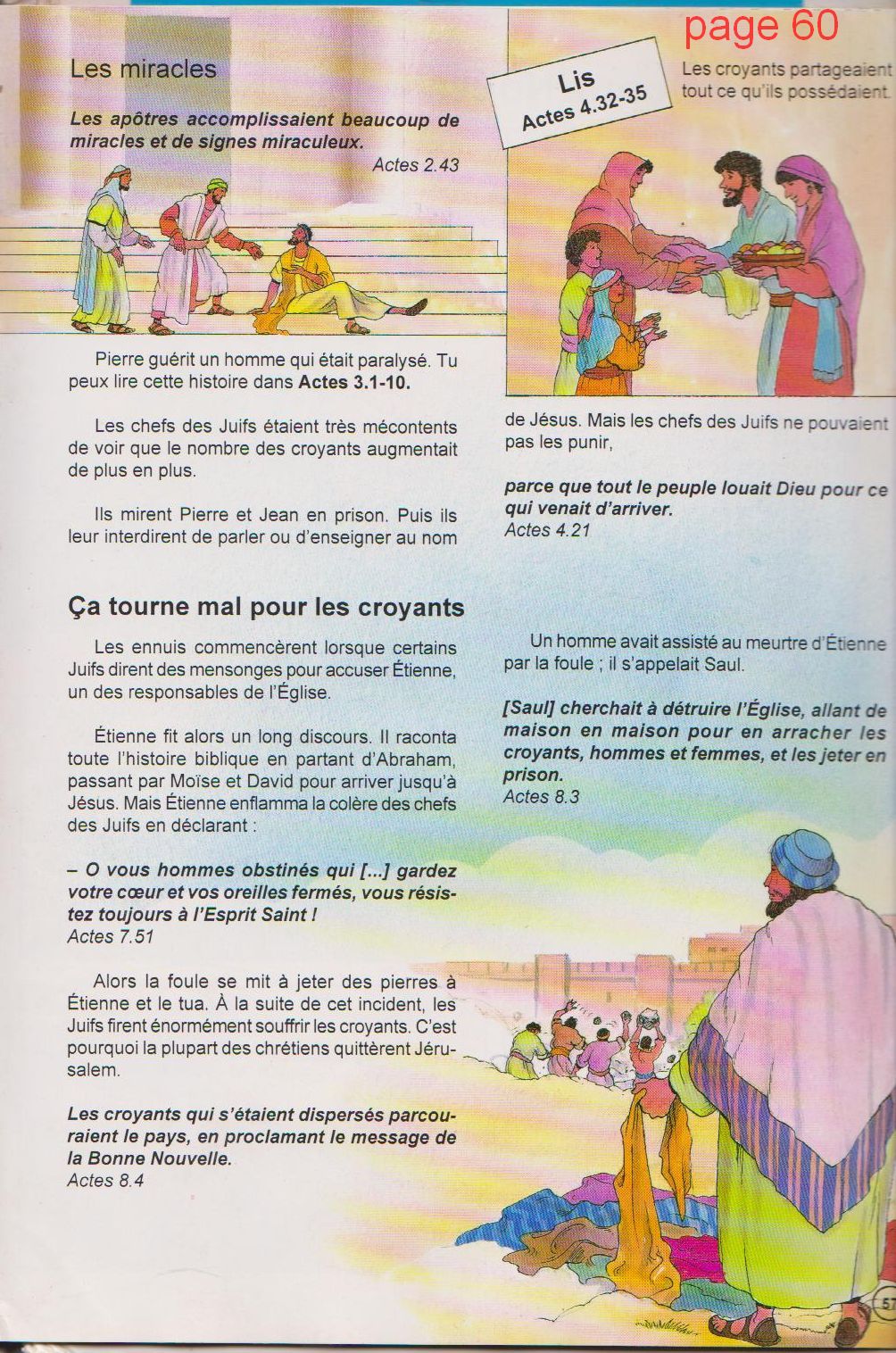 Voici donc que 10 jours après l’Ascension, soit 50 jours après Pâques, les apôtres sont réunis dans une maison , une grand bruit se fait entendre et des langues de feu se disposent au dessus de chacun d’eux et ils furent remplis de l’Esprit Saint Faire lire page 56 à gauche