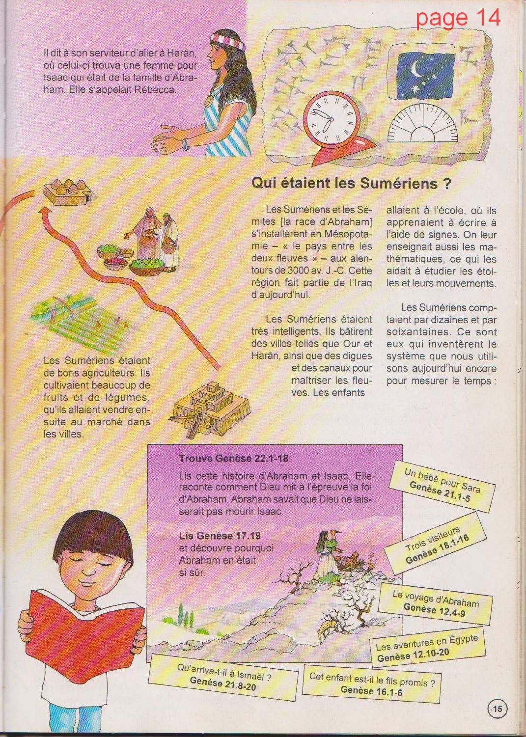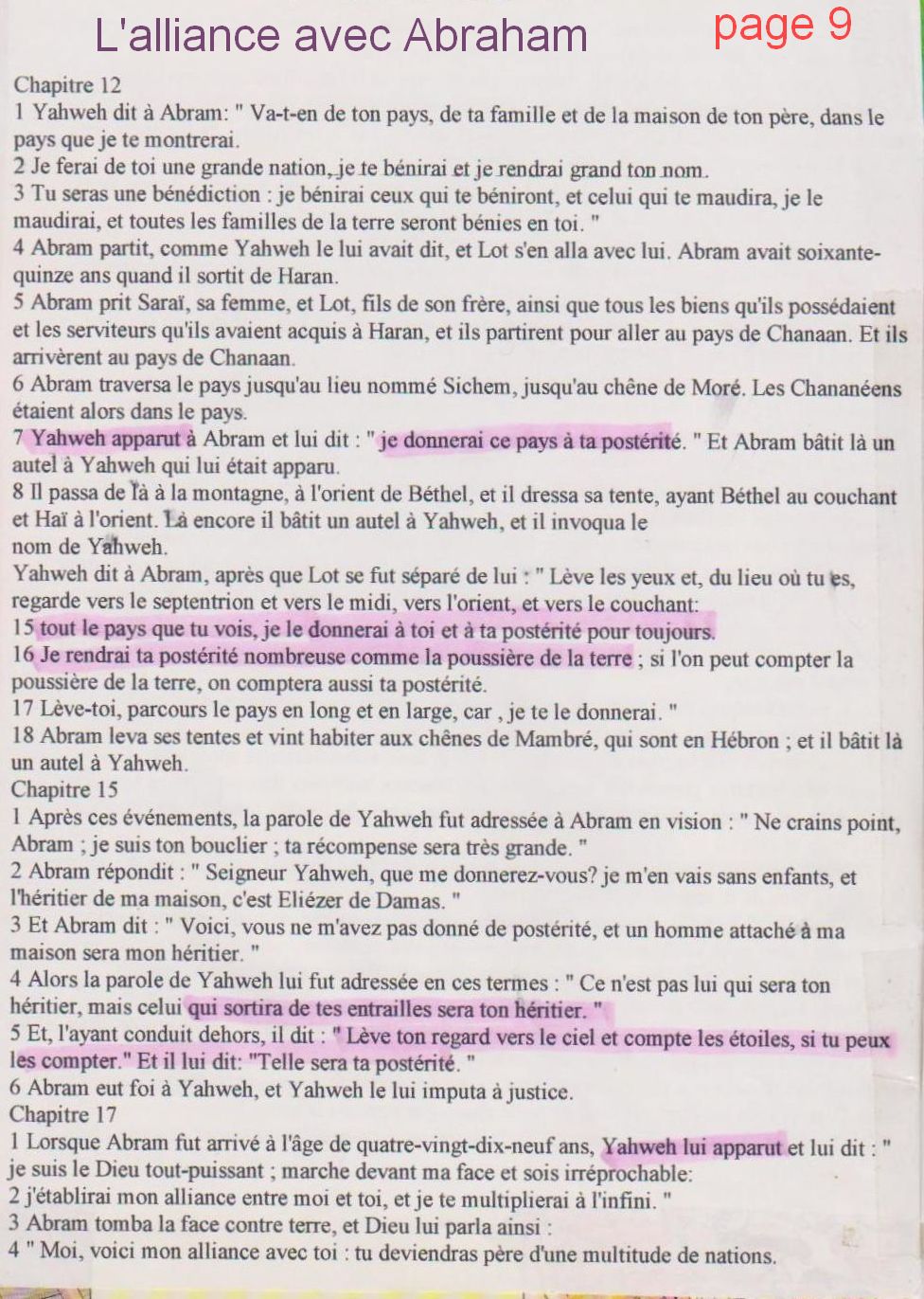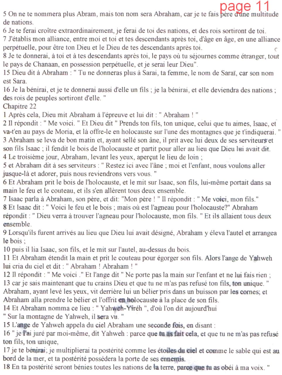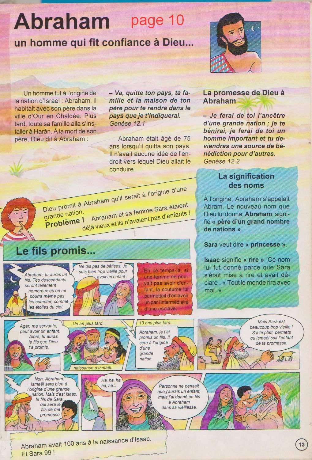 Abram est « pieux » (partout où il arrive, il dresse un autel et offre un sacrifice) page 9, page 9bis,, Il a confiance en la parole de Dieu pour sa descendance et Dieu réalise sa promesse et lui donne un fils par Sara : Isaac