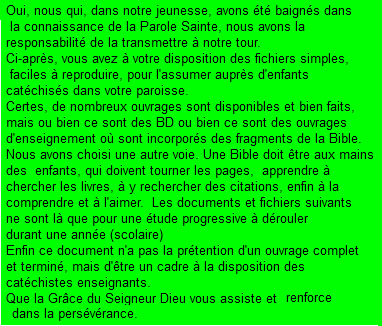 Pour nous , une résolution , à l’occasion de notre enseignement de catéchisme, à lire plus régulièrement ce saint livre pour pouvoir le faire aimer par les enfants.