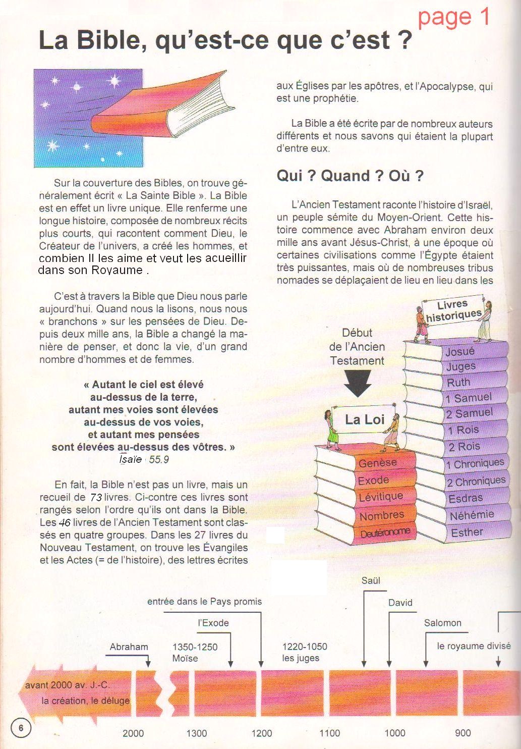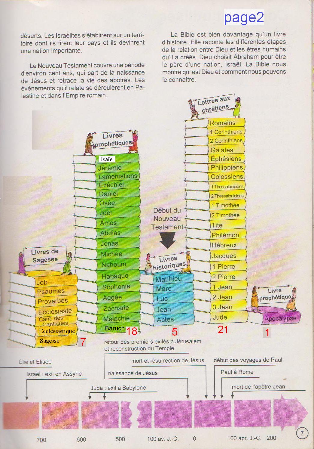 Faire lire la suite = la composition de la Bible, ses différents livres page 1, page 2,et ses regroupements AT et NT page 2bis, les 4 groupes dans l’AT, les livres de la Loi, les livres historiques, les poétiques, et enfin les livres prophétiques. Dans le NT les 4 évangiles, le livre des actes, les lettres et enfin l’Apocalypse