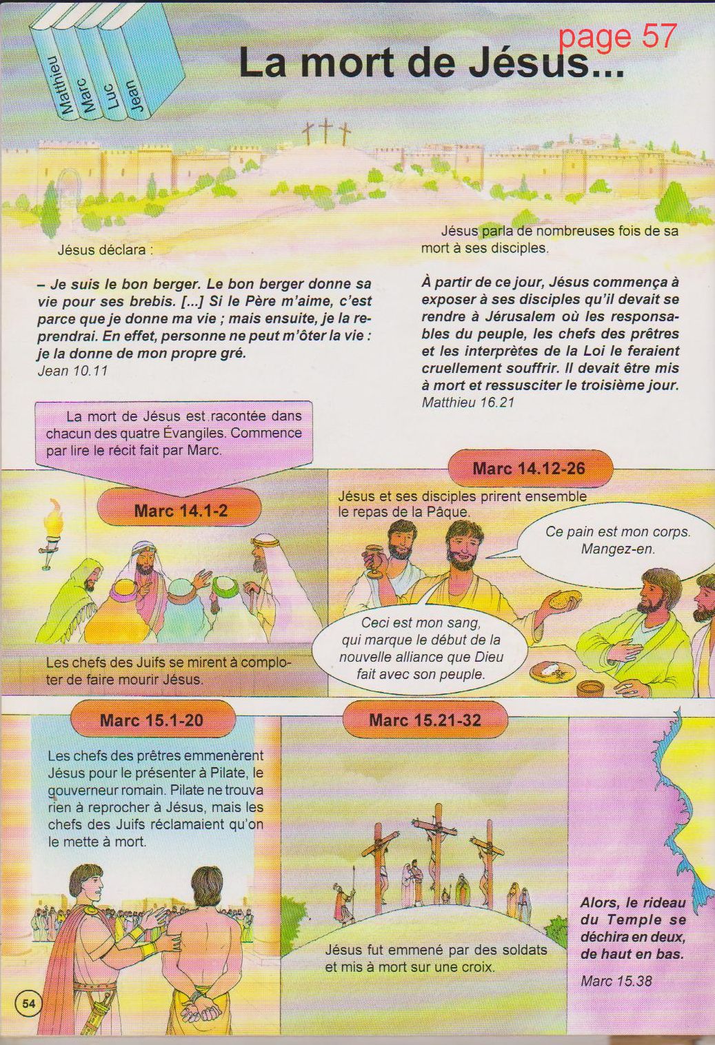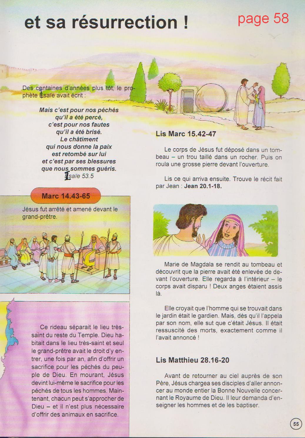 4.entrée en matière : le corps de Jésus a été déposé au tombeau Jésus le vendredi soir et le 3ème jour . Les récits de la résurrection se résument à deux évenements Lire Jean 20, 1-23 1° le tombeau est vide . Au matin, Marie de Madgala vient au tombeau et le voit vide. Les disciples appelés à leur tour constatent de même. 2° Jésus fait son apparition Peu après, dans ce jardin, Marie de Madgala croise Jésus , le reconnaît et tombe à ses pieds. « Rabbouni » s’exclame t-elle (Maître chéri). Dans la soirée, il apparaît aussi aux disciples, s’autentifie en montrant ses mains percées et son coté perforé. Il leur communique l’Esprit Saint. Il convoque en Galilée ses disciples et amis et les renforcer en vue de leur prochaine mission. Il les a appelés à devenir pêcheurs d’hommes par le miracle de la pêche miraculeuse. Une fois encore sur le même Lac de Tiberiade, il renouvelle ce miracle. Jésus restera 40 jours en présence épisodique avec eux pour leur expliquer une fois encore leur mission : » Il commence à justifier cette mission écrite dans la loi de Moïse, les Prophètes et et les Psaumes « ainsi est-il écrit que le Messie devait souffrir puis ressusciter d’entre les morts le troisième jour, et que le repentir pour le pardon des péchés doit être prêché en son nom à toutes les nations , en commençant par Jérusalem. » (Luc 24, 46-47). Marc est encore plus pratique : Il leur dit: « Allez vous-en dans le monde entier et prêchez le Bon Message à toute la création Celui qui croira et sera baptisé sera sauvé, celui qui ne croira pas sera condamné. » Il confirme le pouvoir qui leur sera donné : « voici les miracles qui accompagneront ceux qui auront cru : par mon nom ils chasseront les démons, ils parleront des langues nouvelles,ils saisiront les serpents et s’ils boivent un breuvage mortel, il ne leur sera fait aucun mal. Ils imposeront les mains aux malades et ceux-ci seront en bonne santé. » (Marc 16, 15-18) Faire jouer par les enfants une saynete rapportant le deuxième miracle de la pêche miraculeuse , reproduisant à leur propre imagination le récit de (Luc 21, 2-13)