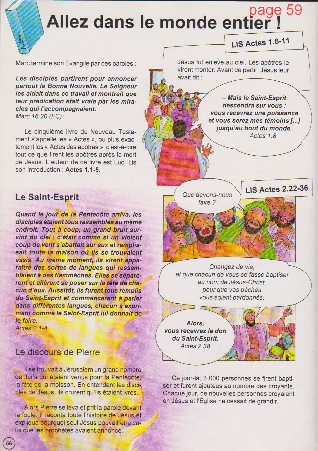 Voici donc que 10 jours après l’Ascension, soit 50 jours après Pâques, les apôtres sont réunis dans une maison , une grand bruit se fait entendre et des langues de feu se disposent au dessus de chacun d’eux et ils furent remplis de l’Esprit Saint Faire lire page 56 à gauche
