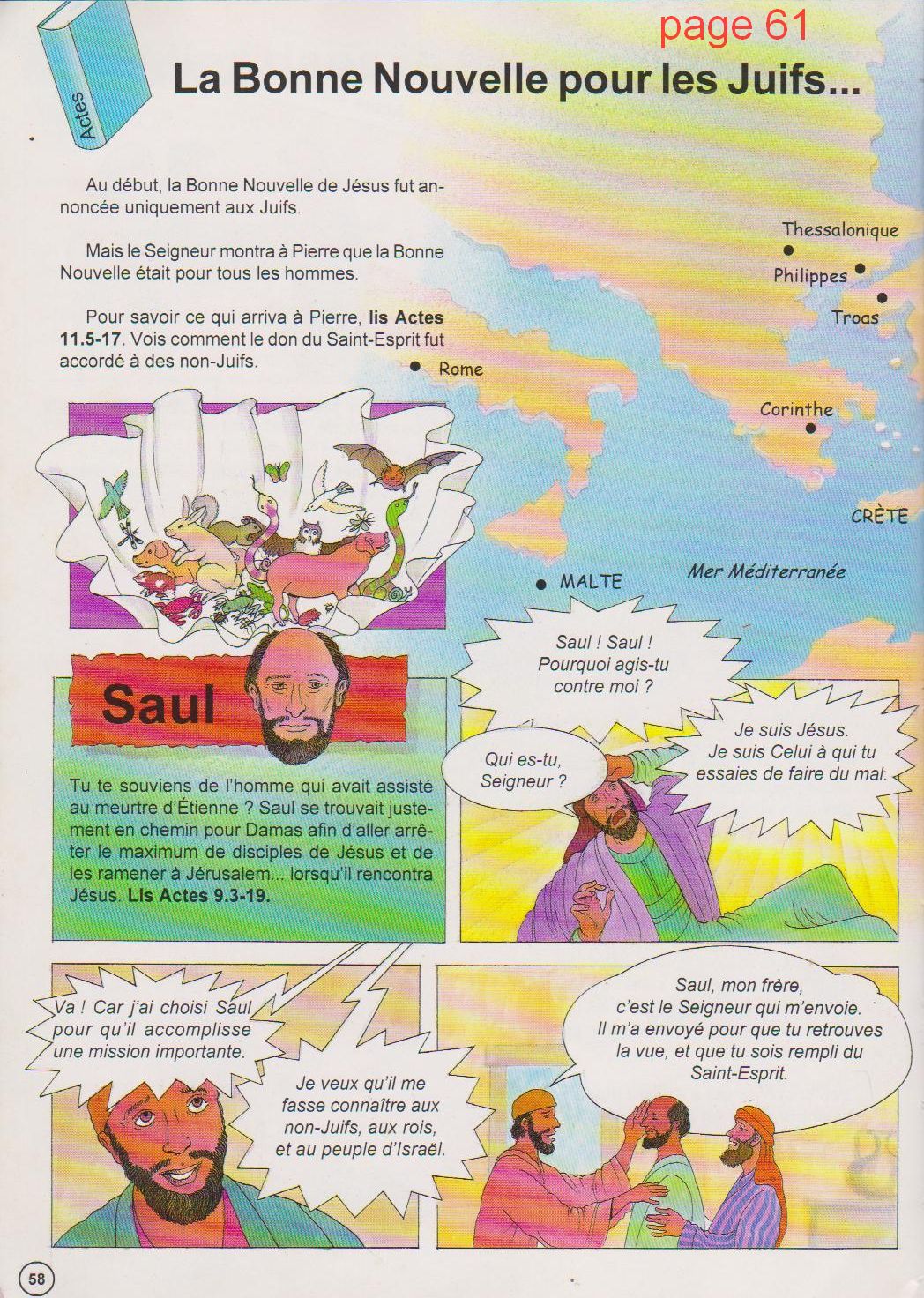 Quelqu’un était là parmi les bourreaux, très enragé contre les chrétiens ; il se nommait Saul (attention, ce n’est pas le premier roi d’Israel) 1 Or Saul approuvait qu'on le fît mourir. (Actes 8, 1) voir l’image en bas de la page 57 Ce personnage très méchant va être converti et devenir un grand apôtre sous le nom de Paul . Voici le récit : 1 Cependant Saul, respirant encore la menace et le meurtre contre les disciples du Seigneur, alla trouver le grand prêtre 2 et lui demanda des lettres pour Damas, à l'adresse des synagogues, afin que s'il trouvait des gens de la secte, hommes et femmes, il les amenât enchaînés à Jérusalem.