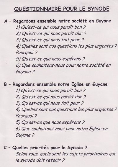 retour au sommaire Pour tous les chrétiens catholiques de Guyane, une réflexion est demandée pour la préparation du synode 2008. Le questionnaire ci-joint est à reproduire par votre imprimante ou disponible au Bureau de notre paroisse. Répondez aux questions et retournez l'imprimé auprès des responsables. Depuis le 19 février, Père Prosper et Père Jude rassemblent chaque mercredi soir un groupe de paroissiens d'horizons divers pour réfléchir au questionnaire et proposer des réponses. Une synthèse est rédigée par un secrétaire de séance. La Paroisse a bon espoir de pouvoir "remettre sa copie" à l'échéance prescrite, une copie riche d'observations et propositions "pesées" avec une esprit de foi, d'espérance et de charité chrétienne. |